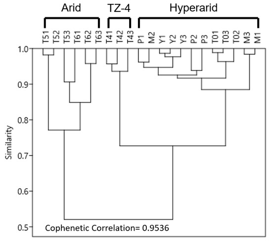 Data from sampling sites were analyzed using the Past 3.26 software [64,65] by hierarchical clustering analysis using XRF results (Table S1), TOC, TN, pH, electrical conductivity, grain size, and mean annual precipitation as primary environmental variables. Algorithm and distance matrixes were set to an unweighted pair group method with arithmetic mean (UPGMA) and Bray–Curtis dissimilarity index, respectively.