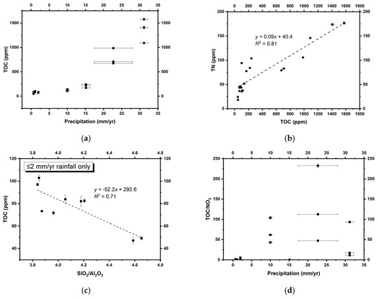 (a) TOC versus inferred annual precipitation; (b) TOC versus TN; (c) TOC versus SiO2/Al2O3 (approximating quartz/clay) ratios in the core Atacama Desert; (d) annual precipitation versus TOC/nitrate ratios. Errors on some TOC, TN, and SiO2/Al2O3 measurements were smaller than the symbols.