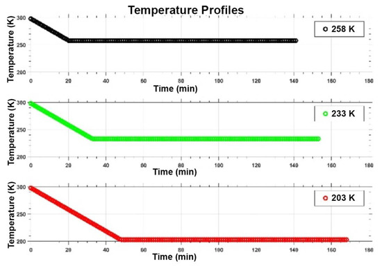 Icy samples were made, following [12], by preparing 10−4 M salt binary solutions, in ultrapure and sterile water (ddH2O), with MgSO4, Na2SO4 and NaCl as solute. For each salt solution three different simulations were performed at 258 K, 233 K and 203 K, by using a climatic chamber capable of reaching 198 K (Angelantoni DY340C, see Figure 2e,f in [33]). The temperature was measured by two Pt100 sensors, one located close to the sample and the other inside the chamber. The climatic chamber is hosted at the Mathematics and Physics Department of Roma Tre University and was designed and built to study different ice physical properties, as a support to the RIME experiment on board the JUICE 2022 ESA mission. It allows to control both temperature and humidity, and to generate temperature gradients as fast as 2 K/min, in cooling mode, and 4 K/min, in heating mode. In each experimental run the cooling time was different, about 20 min, 33 min and 48 min, at 258 K, 233 K and 203 K, as shown in Figure 1. For each experimental run, once reached the lowest value the sample was maintained at such temperature for 2 h.