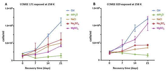 After the exposure for 2 h at 258 K in icy samples containing NaCl, Na2SO4 or MgSO4, cells of strains CCMEE 171 and CCMEE 029 were transferred to liquid BG-11 medium under routine growth conditions. Strain CCMEE 171 survived in the three frozen salt solutions, as shown by their growth recovery (Figure 2A). However, after 21 days of growth, cell densities were lower than that of control, i.e., cells maintained in BG-11 medium under routine culture conditions (Figure 2A). By contrast, strain CCMEE 029 showed a growth recovery comparable to control after exposure to sub-freezing temperature in MgSO4 -H2O solution (Figure 2B); while a reduced growth occurred after exposure in the other salt solutions (Figure 2B). For both strains there were no survivors after exposure to 258 K in ddH2O (Figure 2A,B).