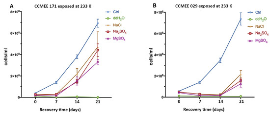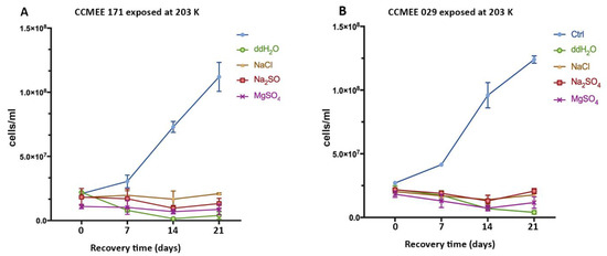 No survivors occurred among cells of strains CCMEE 171 and CCMEE 029 after being exposed for 2 h to 203 K, regardless of the salt used, because no increase in cell densities was observed after transfer to liquid BG-11 medium under routine culture conditions (Figure 4A,B).