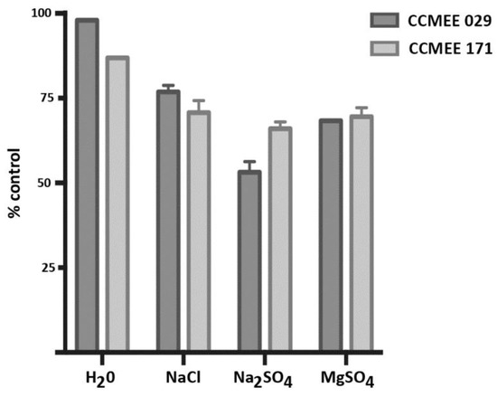 Figure 5. Cell densities of Chroococcidiopsis strains CCMEE 171 and CCMEE 029 incubated in ddH2O, NaCl, Na2SO4 or MgSO4 for 4 h at RT after incubation for 21 days in liquid BG-11 medium under routine culture conditions. Cell densities are shown as % of control (cells maintained in liquid BG-11 medium at RT during the treatment).