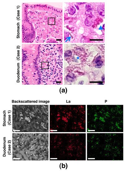 Lanthanum carbonate is one of the therapeutic phosphate binders used to keep optimal serum phosphate levels in dialysis patients with end-stage renal disease [1]. Lanthanum carbonate binds with ingested phosphate to form insoluble complexes in the digestive tract, which are excreted with the feces [2]. However, recent reports have reported that small amounts of lanthanum phosphate are deposited in the stomach and duodenum in patients treated with lanthanum carbonate [3,4,5,6,7,8,9,10,11,12,13,14,15]. The lanthanum phosphate deposition is frequently observed especially in the stomach [6,14], and is suggested to be associated with some pathological conditions such as intestinal metaplasia and foveolar hyperplasia [5,7,8,14]. Cases that show both primary adenocarcinoma and lanthanum phosphate deposition in the stomach have also been reported [3,5,7,11,14,15]. However, whether lanthanum phosphate deposition causes gastric adenocarcinoma has not been elucidated. In a rat model of oral administration of lanthanum carbonate, gastric mucosal alterations such as intestinal metaplasia, epithelial hyperplasia, and proliferation of mucosal neck cells were reported [14]. Regarding the Helicobacter pylori infection status in humans, lanthanum phosphate deposition occurs irrespective of the infection status [8,11]. As various pathological lesions, including malignant neoplasia, can occur in the stomach and duodenum, differential diagnosis of lanthanum phosphate deposition from these pathological lesions is important. In light microscopic observation with hematoxylin and eosin (H&E) staining, the deposits appear as a brown granular, needle-shaped, or amorphous substance within and outside the histiocytes [9,12]. Sometimes their colors are described as eosinophilic, grey, or purple [3,7,9,13]. It is important to diagnose definitively whether the deposits showing several different shapes or colors are lanthanum phosphate or not using element analysis such as an energy dispersive X-ray spectroscopy (EDS) combined with a scanning electron microscopy (SEM) [11,13]. However, preparation of samples for the traditional SEM-EDS requires several complicated procedures, using at least two different pathological slides and sputtering metal particles, such as osmium tetroxide, which is harmful to humans [16]. Therefore, element analysis is rarely performed and the deposits are diagnosed only based on the slight differences observed under a light microscope in routine pathological diagnosis.