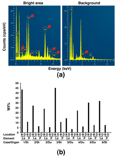 To explore whether SEM observation using the NanoSuit-CLEM method is useful for the diagnosis of lanthanum phosphate deposition in the gastrointestinal tract, we first performed SEM observation in six cases (cases 1–6) having a pathological record of brown pigment deposition, which were suspected as lanthanum phosphate deposition, in the H&E slides, either or both of stomach and duodenum (Figure 2a; representative images showing deposition exhibiting granular, needle-shaped, or amorphous structure), known as target organs of lanthanum phosphate deposition [8,12]. The same area was observed with the aid of the NanoSuit-CLEM method. The area where brown pigment deposition consisting of granular, needle-shaped, and/or amorphous structures was observed under a light microscope showed bright contrast in backscattered images, which were the images of incident electrons reflected back from the specimens, using SEM in all the eight slides derived from six cases (Figure 2b, Supplementary Figure S1). Further elemental mapping by SEM-EDS revealed the localization of lanthanum (La) and phosphorus (P) in the bright area through the backscattered images (Figure 2b, Supplementary Figure S1). Moreover, comparative analysis of the EDS spectrum showed that the counts (cps/eV) both of La and P in the bright area were much higher than those in the background in other dimmer mucosal area (Figure 3a); the weight percentage (wt%) values were significantly higher in the bright area than in the background (p < 0.001 for both La and P; Figure 3b; Wt% values of elements other than La and P in the analysis were summarized in Supplementary Table S1). These results indicated that the brown pigment deposition under light microscope, corresponding to the bright area in an SEM, was identical to lanthanum phosphate deposition in this experiment. Since previous literature reported the existence of adenocarcinoma in the stomach where lanthanum phosphate deposition was observed [3,5,7,11,14,15], we also examined whether there is a history of gastric or duodenal adenocarcinoma in our cases. Then we found that one case (case 6) was affected by early-stage gastric adenocarcinoma (Supplementary Figure S2) and lanthanum phosphate was deposited in the stomach (Supplementary Figure S1), meaning it is an applicable case.