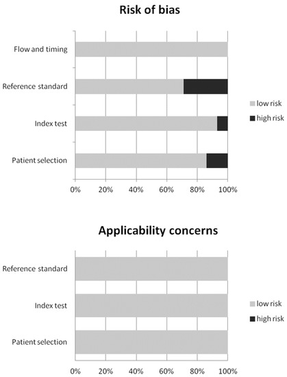 - Whiting, P.F.; Rutjes, A.W.; Westwood, M.E.; Mallett, S.; Deeks, J.J.; Reitsma, J.B.; Leeflang, M.M.; Sterne, J.A.; Bossuyt, P.M. QUADAS-2 Group. QUADAS-2: A revised tool for the quality assessment of diagnostic accuracy studies. Ann. Int. Med. 2011, 155, 529–536. [Google Scholar] [CrossRef] [PubMed]