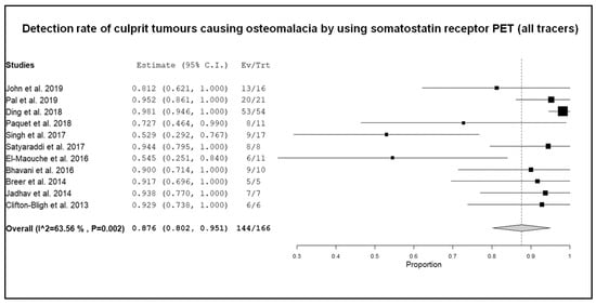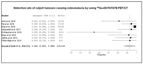 To the best of our knowledge, this is the first systematic review and meta-analysis which has evaluated the DR of culprit tumors in patients with TIO using SSTR-PET/CT. Several studies have been published on this topic, but these studies have a limited statistical power, as a small number of patients with TIO were enrolled due to the rarity of the disease. Therefore, we have pooled data reported in the published studies, to obtain more robust estimates on the DR of SSTR-PET/CT in this setting.