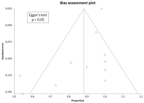 Funnel plot of the included studies about the detection rate of culprit tumors causing osteomalacia using SSTR-PET/CT. The plot demonstrates an asymmetric distribution of the outcome measure suggesting the presence of a possible bias. The little circles in the images represent the outcome measure of the single studies.