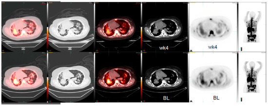 18F-FLT PET/CT scans shows weak signals of early response to MET inhibitor targeted therapy whereas the conventional CT scan images do not show any responses in a patient with lung adenocarcinoma (BL, baseline; wk4, at 4 weeks post therapy).
