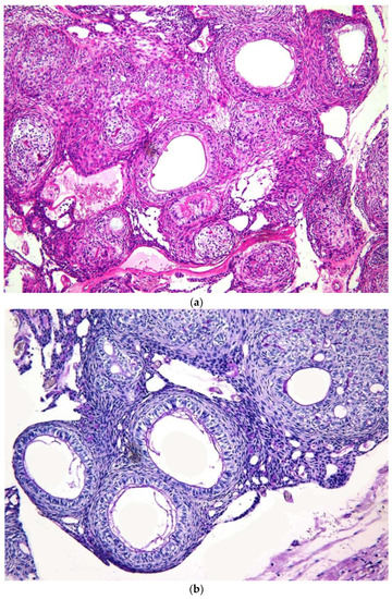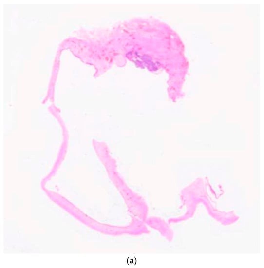 The AOT is histopathologically characterized by variably sized nodules or interlacing strands of odontogenic epithelium forming duct-like structures, rosettes, and whorls in a stroma containing calcified material, hyaline tumor droplets and loosely arranged connective tissue (Figure 2a,b) [,]. No significant differences were observed with reference to the histopathological presentation of the AOT component of cystic vs. classic lesions. In addition, Jivan et al. 2008 [] describe the occurrence of secretory structures, in which dental matrix material is surrounded by a single layer of tall columnar secretory cells arranged in a circular or duct-like configuration. The PAS-positive dental matrix material identified within the secretory units have been considered as enameloid-like material []. A similar presentation was also observed in some of our cases (Figure 2b) and as suggested by Jivan et al. (2008) [], this fact can be considered as evidence of inductive changes that occur in AOTs.