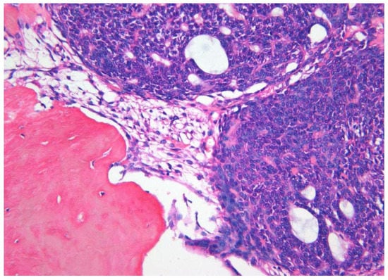 Both cystic and solid AOTs were histopathologically characterized by the presence of duct-like structures, epithelial whorls, and rosette-like structures (Figure 2a). However, though statistically insignificant epithelial whorls were more consistently identified in AOTs compared to duct-like structures (p > 0.8) (Table 1). Further, the majority of the tumors presented with tumor droplets and calcifications (Figure 2b). The only unique histopathological feature that differentiated cystic from classic tumors was the complete or partial cystic epithelial lining in the former lesion, while none of the histopathological features of AOT could be used to differentiate the two groups of lesions. Another interesting finding was the presence of dentinoid in AOTs. Out of the two lesions with massive amounts of dentinoid, one tumor presented as a large mandibular lesion which extended from right first premolar to left second premolar region in a 15-year-old female. Histopathologically a predominantly cystic lesion lined by thin bi-layered epithelium with duct-like structures and epithelial whorls were identified, together with large areas of dentinoid/osteodentine and melanin (Figure 3a,b). The other tumor with dentinoid occurred in a 33-year-old female and presented as an un-encapsulated 4 × 4 cm lesion in relation to the lower molars. The tumor was composed of predominantly small blue cells showing duct-like structures, occasional mitoses, and marked osteodentine (Figure 4). Due to the infiltrative nature, both lesions were radically treated with marginal mandibulectomy, in contrast to simple excision or enucleation performed for the majority of the AOTs.