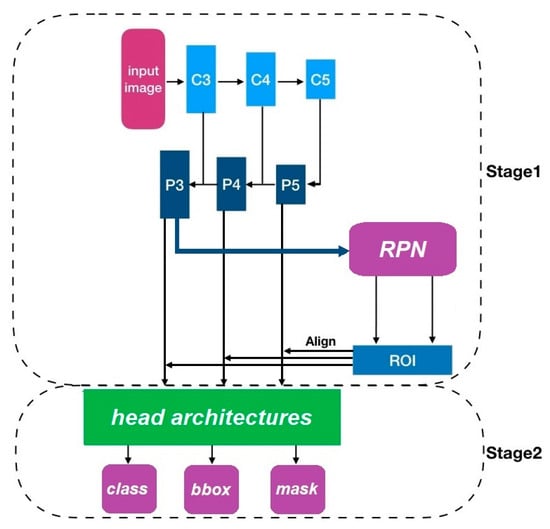 Schematic of Mask R-convolutional neural network (CNN) method. The features computed from the C3…C5, P3…P5 pyramid structure are fed into the Region Proposal Network (RPN) and also into the Mask R-CNN classification step. ROI: region of interests.