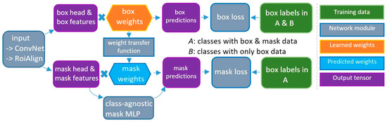 Several other deep learning methods in the R-CNN family also require strongly annotated data, limiting their use when only object bounding boxes are available. The MaskX R-CNN [10] network was created to address this “data annotation gap” in the training process by taking advantage of both types of annotations, bounding box and mask. Briefly, MaskX R-CNN augments the Faster R-CNN bounding box prediction model with additional mask processing which consists of a small convolutional neural network (weight transfer network) and a Multi-Layer Perceptron (MLP), together known as “mask heads” (Figure 4). MaskX R-CNN can be trained using two strategies, depending on how “mask heads” are used: (i) stage-wise training; and, (ii) end-to-end training.