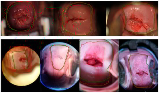 We also study images that have relatively low Dice and IoU scores, which we denote as “error cases”. In Figure 8, we show examples of such cases (Dice score < 0.9) due to mismatch with pre-defined ground truth; most of these have the presence of visual distractors such as pubic hair, intra-uterine devices (IUDs), the speculum, and even parts of human hands. In some images we even find that the cervix region occupies less than 50% of the entire image. We also observe that low Dice/IoU scores could be a result of false negatives of the ground truth annotations, suggesting subjectivity in the markup.
