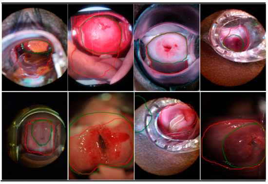 Although deep learning techniques have been widely applied for segmentation tasks in various medical image modalities, few research groups report applying them for cervix region segmentation in photographic images of the uterine cervix. The deep learning U-Net [21] algorithm was applied for the work reported in [22] on 6692 images from the Intel & MobileODT Cervical Cancer Screening Competition [6]; these images were cropped into 32 × 32 pixel patches; the quantitative results were not reported, however, this might be because, similar to [17], the cervix segmentation was just used as preprocessing for the subsequent classification network. In [23,24,25], a convolutional neural network (CNN) model is implemented over a cervix dataset collected by MobileODT (Kaggle Dataset); the reported average Dice score is 0.67. Very recently, one research group applied Mask R-CNN on cervix segmentation tasks, the obtained (Dice, IoU) score is (0.8711, 0.765) on “Kaggle Dataset” as reported in [26]. We use the same dataset in our study and compare our results with these techniques.