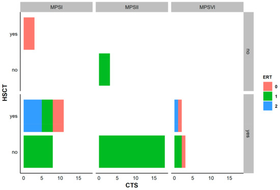 Specific therapies for MPS and treatment. Visualization of the explored specific therapies for MPS, including enzyme replacement therapy (ERT) and hematopoietic stem cell transplant (HSCT), along with the occurrence of CTS. ERT 0 = no treatment, 1 = chronic treatment, 2 = temporary treatment. CTS numbers correspond to the number of patients. In MPS I patients, we differentiate 3 groups: one which received HSCT without ERT and had no CTS, one treated exclusively with ERT where all had CTS, and one which received ERT temporarily or chronically or received no ERT where all had CTS. In MPS II patients, all of them took ERT and the majority have CTS. In MPS VI patients, all have CTS, whatever was the type of treatment for the disease.