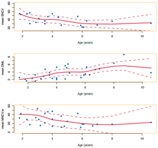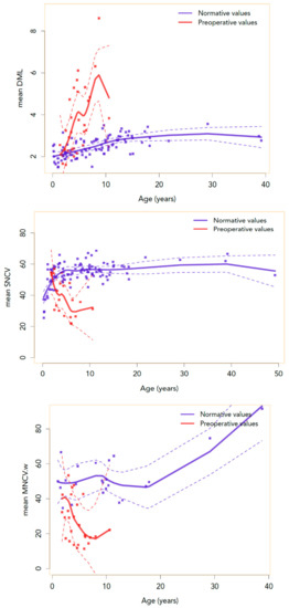 Normative and preoperative values of SNCV, MNCV-w, DML with age. The curves represent the Loess non-parametric regression normative and preoperative values of SNCV, MNCV-w, and DML with age. There is an intersection between normative and preoperative values of SNCV at 26 and 17 months for DML, suggesting that electrophysiological abnormalities appear around these ages.