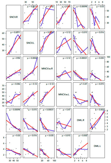 Correlation between SCNV, MNCV-w, DML. There is a negative correlation between DML, SNCV, and MNCV-w. We also explored whether a difference exists between right and left hand but the results were comparable.
