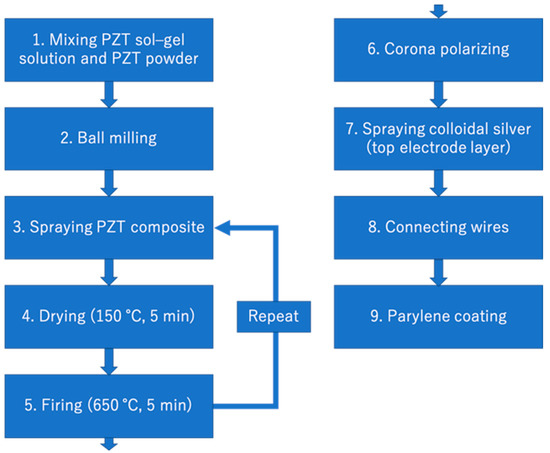 We apply the sol-gel composite spraying technique to develop a concave-shaped single ultrasonic transducer. The general fabrication process of the sol-gel composite ultrasonic transducer is described below. First, a commercial PZT powder (Hizirco PZT L, Hayashi Chemical Industry Co., Ltd., Kyoto, Japan) [21] and a PZT sol-gel solution created in our laboratory are mixed at 1:2 ratio by weight using a ball milling machine for at least 24 h. Subsequently, the composite material is sprayed on a thin stainless-steel plate using a customized automatic coating machine at 25 °C. The thin stainless-steel plate is also used as a bottom electrode. After spraying, drying is performed at 150 °C for 10 min and firing is performed at 650 °C for 5 min. The spraying, drying, and firing processes are repeated until the PZT/PZT layer reaches a desirable thickness. After the PZT/PZT layer fabrication process, polarization is performed for 5 min at room temperature using a corona discharge device. After polarization, the piezoelectric d constant, d33, is measured using a d33 m (ZJ-3B, IACAS) to evaluate the fundamental performance of the transducer. The flowchart of the fabrication process is shown in Figure 2.