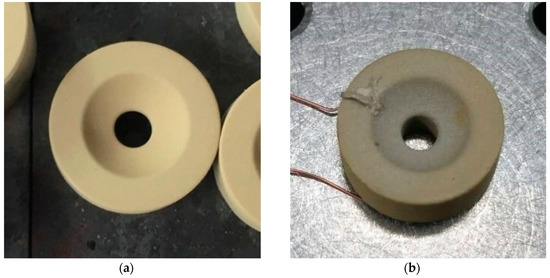 Fabricated transducer (a) after spraying, drying, and firing processes and (b) after connecting wires.