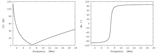 To evaluate the performance of the fabricated transducer, its electrical impedance was measured using a network analyzer (E5061B, Keysight Technologies, Inc., Santa Rosa, CA, USA). The measured frequency characteristic of the electrical impedance is shown in Figure 6. According to this figure, the resonant frequency is 7 MHz. However, an antiresonant frequency is not seen below 30 MHz. Therefore, it can be predicted that the antiresonant frequency is considerably higher than 30 MHz.