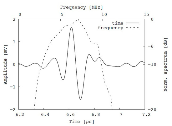 Pulse-echo signal obtained from copper wire using fabricated focused transducer through pulse-echo testing in time (solid line) and frequency (dashed line) domains.