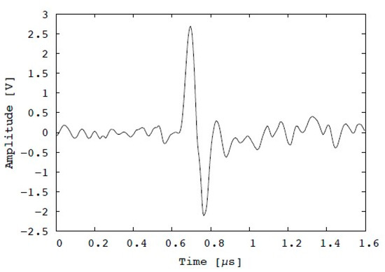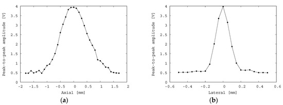 A pulse-echo experiment was conducted with the experimental setup as described in Figure 5 to characterize the acoustic resolution performance of the fabricated transducer. In the experiment, the fabricated transducer was fixed by a clamp with a 3-axis stage and moved to perform scans in the lateral and axial directions. A transparent phantom was constructed, which consisted of a copper wire with a diameter of 0.15 mm embedded in transparent agar with a sound velocity of approximately 1500 m/s. The agar phantom was placed in a water tank, and the echo signals from the copper wire were collected. An example of an echo signal from the copper wire is shown in Figure 7. The center frequency is approximately 7 MHz, and its −6 dB frequency bandwidth is 6 MHz (3.5–9.5 MHz). Hence, the relative frequency bandwidth is 86%. This bandwidth is fairly broad considering that matching and backing layers were omitted in the fabricated transducer. Figure 8 illustrates the axial and lateral resolution obtained by measuring the amplitudes of the echoes from the copper wire by moving the 3-axis stage. The maximum peak-to-peak amplitude is approximately 4 Vp-p, and the full width at half maximum (FWHM) is approximately 1.25 mm and 0.2 mm in the axial and lateral directions, respectively. It is found that a satisfactory large amplitude and small focal size are obtained owing to the curved shape of the fabricated transducer.