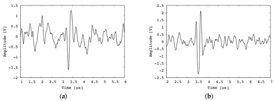 The experimental setup for PA imaging is shown in Figure 9. In this experiment, a pulsed fiber laser (GLPM-10, IPG Photonics Corp., Massachusetts, Japan) with a wavelength of 532 nm and an input beam diameter of 5 mm was used. The focal length of the objective lens was 30 mm. The theoretical spot size of the laser was 5.5 μm. The pulse energy out of the objective lens was set as 0.6 μJ. This energy is significantly lower compared to previous studies. This is described in detail later. The pulse repetition frequency (PRF) of the emitted pulse was set as 50 kHz. A pulsed laser was generated, and it passed through a beam splitter, which was used for obtaining a trigger signal. Subsequently, the laser was reflected at a mirror, propagated through an achromatic lens (AC254-030-A, Thorlabs, Inc., Newton, NJ, USA), and finally focused at a point in a specimen. The emitted PA signals were received by the fabricated transducer. A conventional OAT consisting of an acoustic lens with a focal length of 12.7 mm, reflecting prisms, and an unfocused transducer (V384, Olympus Inc.) with a center frequency of 3.5 MHz was used as a reference, as shown in Figure 1a. The obtained signals were amplified by a pulser/receiver (MODEL 5800, Olympus Inc.) and a preamp (MODEL 5678, Olympus Inc.). The total gain was 60 dB, the cutoff frequency of the high-pass filter was 1 MHz, and the cutoff frequency of the low-pass filter was 10 MHz. The obtained signals were digitized at a sampling rate of 400 MHz and transferred to a computer, where an image was formed. In addition, ensemble average processing was applied to 20 signals to obtain smooth signals. As a specimen, a copper wire with a diameter of 0.15 mm and a human hair with a diameter of approximately 50 μm were separately embedded in transparent agar and fixed in the water tank. The signals obtained using the fabricated transducer and conventional OAT are shown in Figure 10. As shown in Figure 10a,b, the amplitude of the PA signal obtained using the fabricated focused transducer is 2.8 Vp-p for the copper wire and 4.4 Vp-p for the human hair. On the other hand, no peak is observed in the waveform obtained using the conventional OAT, as shown in Figure 10c,d.