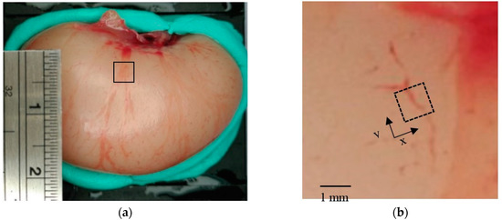 (a) Photographs of chicken testicle and (b) magnified view of the region bounded by the solid black line in (a). Black-dashed box in (b) indicates a scan area with a size of 1 × 1 mm2 (pixel size: 100 × 100). Vessel diameter is less than 75 μm.