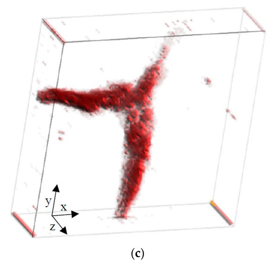 where s is the PA signal obtained from the specimen, x and y are the coordinates, i is discrete time, and N is discrete measured time. First, one maximum value at each pixel was selected for the entire measurement time range to create a two-dimensional MAP image, which is illustrated in Figure 13. The MAP image captures the branching of a blood vessel, which is similar to the shape in the optical image shown in Figure 11. Subsequently, to visualize the specimen three-dimensionally, the obtained PA signal was divided at intervals of 0.125 mm and 20 planes were obtained. Each maximum value was stacked and visualized three-dimensionally. The two-dimensional MAP image obtained at each depth and the three-dimensional MAP image obtained by stacking these images are shown in Figure 13a,b, respectively. Even though the conventional OAT with the transducer (V384, Olympus Inc.) was used for measurement as a reference, the PA signal could not be obtained owing to significantly low signal energy that was below the noise level.