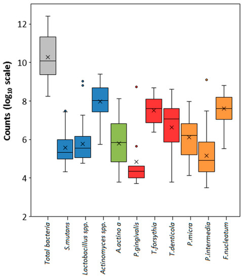 Abundance of bacterial species among the tested interdental site samples. The counts are reported on a log10 scale. Blue boxes correspond to the subtotals for species of cariogenic bacteria. Red and orange boxes correspond to the subtotals for species of the Socransky red and orange complexes.