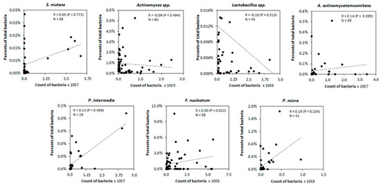 Correlation plots between the counts of bacteria and their percentage content in samples. Exceptional values in Lactobacillus spp. and A. actinomycetemcomitans were omitted from the analysis. Black dots correspond to individual analyzed samples and dotted line shows trend line on a scatter plot.