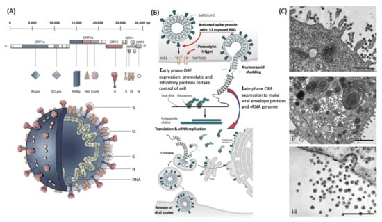 Molecular cellular pathology of SARS-CoV-2 infection: Panel (A) Schematic Illustration of SARS-CoV-2 viral RNA genome in relation to order of expression and functional incorporation with the Virion particle. The genome comprises a 5′-untranslated region (5′-UTR), open-reading frames (ORFs) 1a and 1b encoding nonstructural proteins 3-chymotrypsin-like protease (3CLpro), papain-like protease (PLpro), helicase (Hel), and RNA-dependent RNA polymerase (RdRp) as well as accessory proteins, and the structural S protein (S), E protein (E), M protein (M), and Nucleocapsid protein (N) in ORFs 2,4,5 and 9. Panel (B). Schematic of virion fusion mediated by Spike protein attachment to the ACE2 receptor and accessory cleavage of the Spike protein quaternary complex, resulting in fusion peptide exposure and binding to target cell plasma membrane. Focal, host cell and viral envelope lipid bilayer membrane fusion and viral RNA ingress of the target host cell. Shedding of Nucleocapsid and early ORF expression to take control of the cell and inactivate internal anti-viral proteins (e.g., Ubiquitin and RNase). Late ORF expression: replication of viral RNA genome and expression of, via post-translational processing mechanisms of the endoplasmic reticulum and Golgi apparatus (e.g., glycosylation), membrane embedded proteins that are responsible for infectivity including the Spike protein complex. Copies of SARS-CoV-2 vRNA are packaged into lipid bilayer membrane envelopes containing multiple copies of S, E, M and N, glyco- and phospho- proteins. Inclusion transport vesicle, packed with enveloped virions, fuses with host cell membrane releasing infective SARS-CoV-2 virion. Panel (C). Electro micrographs of multiple virions attacking the cell membrane (i), viral genome expression subsuming all functions of the cell to form thousands of virion copies within inclusion vesicles (ii) and finally release of multiple virions by fusion of inclusion packaging vesicles with the cell surface plasma membrane of the infected host cell (iii). Original composite figure adapted in parts from Depfenhart et al. [7] Kupferschmidt and Cohen [8] and Mason [9]. Scale bar: 1000 nm