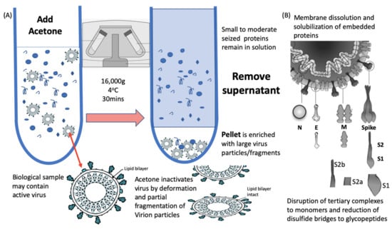 Process of virion enrichment within a biological sample and extraction/solubilisation of Spike (S) and other viral envelope protein for MALDI ToF MS analysis. Panel (A): Biological samples containing virus are mixed 1 to 1 v/v with ice cold acetone and centrifuged at 16,000× g for 30 min at 4 °C. The supernatant containing smaller non-precipitated solutes is discarded. The pellet is enriched with viral particles and kept for analysis. Acetone treatment inactivates envelope virus by deformation and partial fragmentation of the viral envelope and embedded protein Structures A. Panel (B): The pellet is resuspended in 10 to 100 uL of MALDI -ToF Mass spectrometry compatible dissolution and solubilisation buffer. Termed LBSD-X this buffer does not suppress ionisation and contains a detergent at a concentration optimised to release viral envelope embedded proteins together with non-embedded viral proteins. It also contains Dithiothreitol (DTT) in order to further reduce disulphide bonds so that quaternary and tertial structures are fully disrupted and monomers, polypeptide chains and glyco-polypeptides are liberated for detailed mass analysis.