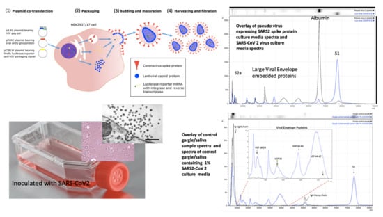 Mass spectral profiles of Pseudo Virus expressing SARS-CoV-2 Spike S protein grown in culture, SARS-CoV-2 virus grown in vitro and mass spectra of gargle/saliva spiked with culture media from cells infected with SARS-CoV-2: S proteolytic fragments S1 and S2 were seen in all preparations and S2b only in serum free samples. Viral envelope proteins (VEPs) became more prevalent in live virus culture and Ig light chains and IgA heavy chain were additional peaks found in gargle/saliva samples. HEK293T/17 cells were seeded into 6 well cell-culture plates and co-transfected after 24 h with p8.91 (gag-pol expression plasmid), pCSFLW (luciferase reporter plasmid), and a viral glycoprotein expression plasmid encoding the spike protein of either SARS-CoV-2. The transfection mixture was prepared in OptiMEM using FuGENE-HD as a transfection reagent; cell culture media was replaced prior to transfection. The cell supernatant was collected via syringe 48 h after transfection and filtered through a 0.45 µm filter to harvest the lentiviral pseudo-type particles [28]. Pseudo virus expressing post translationally modified and conformational function SARS S protein and live SARS-CoV-2 virus where grown in culture, under category 3 containment conditions, on Vero-Green Monkey cells. Virions present in the culture media were filtered (0.45 µm), acetone precipitated-enriched as described and all viral envelope proteins, including S protein fragments, extracted and solubilized using extraction formulation LBSD-X buffer and detected as mass peaks by MALDI ToF MS. Scale bar: 1000 nm