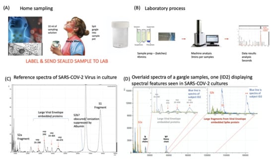 Clinical diagnostic protocol of gargle saliva collection, laboratory processing and spectral data features: Panel (A) illustrates patient (home) sampling gargling 10 mL of water and spitting that into a sample pot. Panel (B) illustrates rapid processing where received gargle sample is filtered through 1.2 and 0.45 mm filters, 5 mL is recovered and is acetone precipitated. The pellet is resuspended in viral envelope dissolution and protein solubilization buffer before being applied to MALDI ToF plates and analyzed (3 min per sample); output data being processed by appropriate software. Panel (C) illustrates a reference spectra of SARS-CoV2 grown in vitro with spectral pattern of viral envelope proteins (VEPs) and fragments of coronavirus spike protein labelled. Panel (D) illustrates overall spectra of 5 unscreened volunteer samples overlaid. The spectra from subject ID2 is indicated (blue line). Regions corresponding to mass ranges for VEPs and large characteristic fragments of the Spike protein are illustrated. These are illustrated in juxta position to gargle/salivary Immunoglobulin light chain and Ig A heavy chain peaks. Also to note that S2a fragment is surrounded by a host of high intensity/abundance proteins, the origins of which may be a mix of other co-enriched (bacterial) micro-organism from the oral cavity. An additional high molecular mass glyco-protein type peak was also seen at with a maxima at 112,000 m/z (marked **) was only seen in this sample.