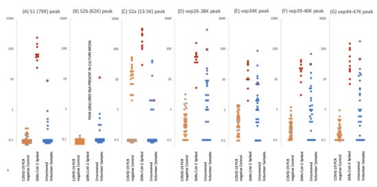 To estimate sensitivity and specificity saliva/gargle (n = 10) was spiked with spent Vero cell culture media producing SARS-CoV-2 at a concentration of 104 to 105 PFU/mL. These were subject to MALDI-ToF mass spectrometry and the peak heights measured for the peaks of interest. Two RT-PCR negative persons simultaneously provided gargle/saliva samples at the time of swab sampling. These confirmed PCR-negative gargle samples were analysed by MALDI-ToF mass spectrometry 40 times; the measured peak intensities of which acted as comparative controls to the viral spiked saliva/gargle. Viral envelope protein peak intensities were clearly elevated in the spiked samples (Figure 5). Gargle/saliva was collected from 35 volunteers who did not have simultaneous COVID-19 PCR determinations, although some suspected they had suffered from the infection but were recovered or recovering. The intensity of S protein fragments S1 (79,000 m/z), S2b (62,000-72000 m/z) (can be obscured by albumin if present) and S2a (13,500 m/z) were measured along with peaks masses thought to represent other viral envelope proteins (VEPs). The maximal intensity was measured for these broad glycoproteins peaks at 26,000–28,000 m/z (vep26–28K), 34,000 m/z (vep34K), 39,000–40,000 m/z (vep39–40K) and 45,000–47,000 m/z (vep45–47K).