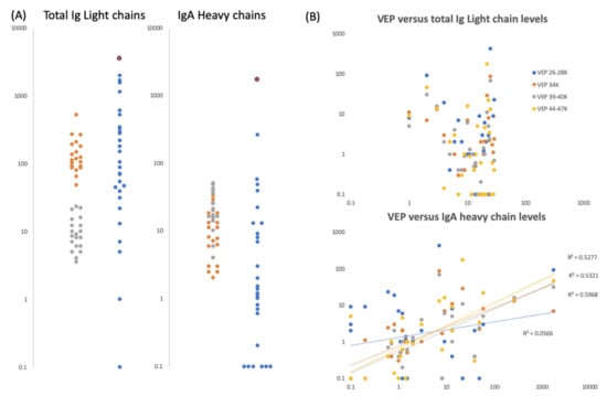 Gargle/saliva Immunoglobulin protein levels. Panel (A) are plots comparing the total Ig light chain and total IgA heavy chain peak intensity levels for two COVID-19 PCR negatives control individuals (grey and orange dots respectively) repeated 20 times each (n = 40), versus the same peaks intensity level of 30 volunteers (blue dots) who gave gargle/saliva samples but whose COVID-19 PCR status was unknown at the time. Blue dots bound by a red circle are the levels of total Ig light chains and IgA heavy chains found in volunteer ID2. Panel (B) are scatter plots of total Ig light chains (upper plot) and IgA heavy chain peak intensities (lower plot) versus VEPs peak intensities for the 30 volunteer gargle/saliva samples but whose COVID-19 PCR status was unknown at the time. No VEP level correlated with total Ig light chain level. Correlation were seen with Ig A heavy chain levels for vep39–40K (grey dots r2 = 0.60), vep44–47K (gold dots r2 = 0.53) and vep34k (orange dots r2 = 0.53) but not for vep26–28k (blue dots r2 = 0.06)