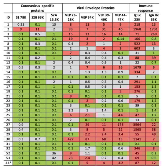 Illustration of clinical data output. Format is a heat map scoring of peak intensity relative to those values for SARS-2 coronavirus spike protein fragments and viral envelope proteins, measured in gargle/saliva containing 1–10% culture media of SARS-CoV-2 virus at 104 per ml PFU. Red indicating elevated, Grey indicating slight to moderate increase and Green indicating within normal range. Heat map associated with immunoglobulin intensities are based on the range found in the volunteers for which volunteer ID2 was identified as recovering from suspected COVID-19 infection. ID2 was repeated after 14 days and his scores are shown under ID44 *.