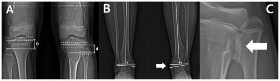 Characteristic factors that have been associated with higher rates of ankle valgus deformities include an ankle valgus over 10° in males and exostoses on the proximal and distal tibia or fibula [10,11]. However, there is a lack of research analyzing the tibiofibular relationship, especially longitudinal observation studies investigating tibial and fibular growth. Furthermore, the literature is sparse in identifying factors related to the progression of ankle valgus and relative fibular shortening during growth periods.