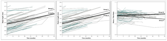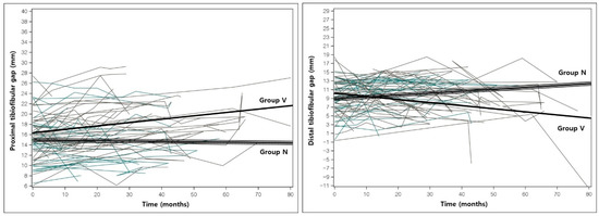 The estimated slopes of change between the initial and final measurements were analyzed using a linear mixed model. Group N had a significant constant increase in the proximal physes gap (0.062, p < 0.001) and the fibular (0.977, p < 0.001) and tibial (0.941; p < 0.001) lengths. Group V had a significant increase in the tibia and fibular length, the proximal physes and epiphyses gap, and the tibiotalar angle (Figure 2 and Figure 3), but a decrease in the LDFA, the fibula/tibia ratio, and the distal physes and epiphyses gap. In terms of the differences between the slopes of both groups, significant differences were identified in the tibial length, the fibular/tibial length ratio, the proximal and distal epiphyses gap, and the tibiotalar angle (Table 3).
