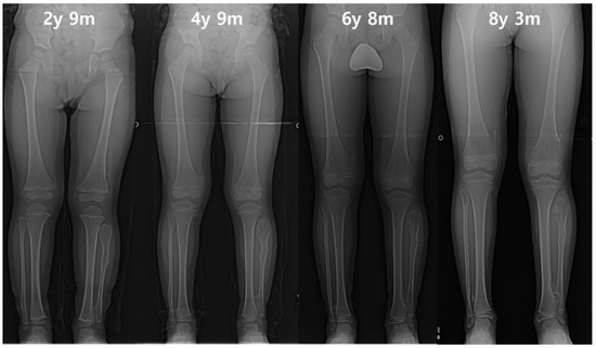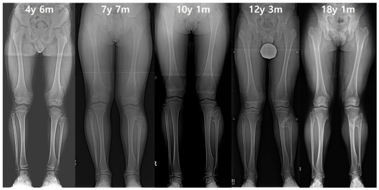 This retrospective study was approval by the institutional review board of the Severance Hospital, Seoul, Korea (28 November 2013; 4-2013-0700). Medical records and plain radiographs of patients who were skeletally immature at their first visit and underwent two or more full-length standing anteroposterior (AP) radiographs of the lower extremities during their follow-up were reviewed. Patients with a previous surgical history of the lower extremities and a limb-length discrepancy of over 2.5 cm, measured in any of the radiographs, were excluded. Among 53 patients who were initially enrolled, a total of 20 patients were excluded due to surgical history of their lower extremities (16 patients) and limb-length discrepancy of over 2.5 cm (4 patients). A total of 265 full-length radiographs of 63 affected legs in 33 patients were finally included in the study. The cases were divided into two groups of Group V and Group N, according to whether the tibiotalar angle increased into a more valgus position (Group V), or decreased into a more varus position (Group N) at the final evaluation when compared to the initial visit.