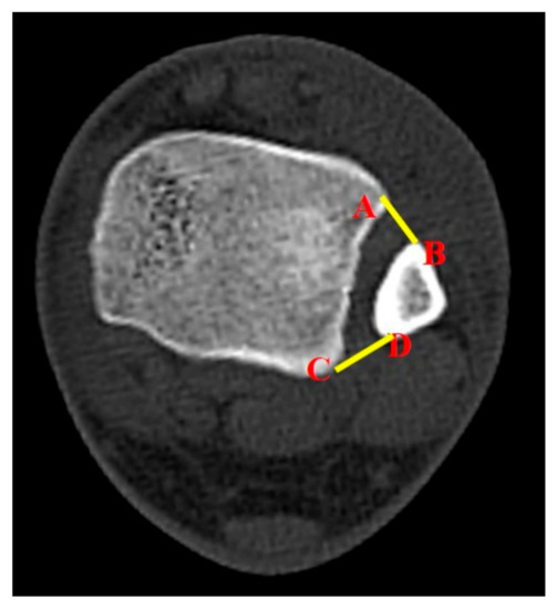 The surface area of syndesmosis, which was measured as a new parameter between four anatomic landmark points on the axial CT image; the points that link the anterior colliculus of the tibia (A), the most anterior aspect of the fibular (B), the posterior colliculus of the tibia (C), and the most posterior aspect of the fibular (D).