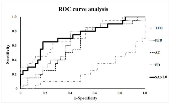Statistically significant differences were found between the ratio (injured/intact) of TFO (p = 0.001), PFD (p = 0.047), APT (p = 0.044), and FD (p = 0.003) between both groups. SAS 1.0 (p = 0.002) was also significant, whereas SAS 1.5 (p = 0.125) was confirmed as not statistically valid (Table 2). Within these proven parameters, the researchers performed a ROC curve analysis. The result showed that the ratio of SAS was the most reasonable, having the highest sensitivity and specificity among the other parameters of radiograph and CT (95% confidence interval = 0.598–0.869) (Figure 3) (Table 3). Its cut-off value is 1.56. In group A, 13 patients (65%) showed SAS 1.0 ratios higher than 1.56. In group B, six patients (12%) showed SAS 1.0 ratios higher than 1.56. In addition, TFO was the highest for the positive prediction value, and PFD and FD were the highest for the negative prediction value (Table 4). SAS 1.0 was 52% and 84% in positive prediction value and negative value, respectively, and statistically, the diagnostic significance of SAS 1.0 was similar compared to the four parameters (TFO, PFD, APT, and FD).