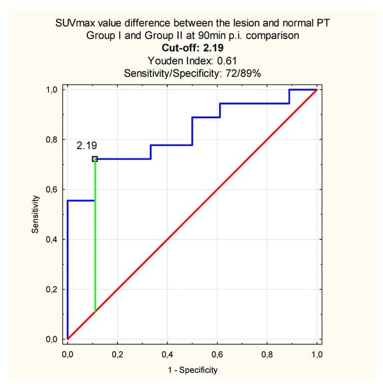 The SUVmax value within the PT inflammation on the initial and delayed PET/CT scans ranged, respectively, from 3.21 to 4.79, 3.43 to 5.18. The PT tumors SUVmax value was 5.45 to 9.92 at 60 min p.i. and 6.02 to 10.75 at 90 min p.i. of the 18 F-FDG. The SUVmax value cut-off points at 60 and 90 min p.i. of the 18 F-FDG were: 4.10 (sensitivity/specificity = 83/67%, Youden Index = 0.50), 4.44 (sensitivity/specificity: 85%/71%, Youden Index = 0.50), respectively.