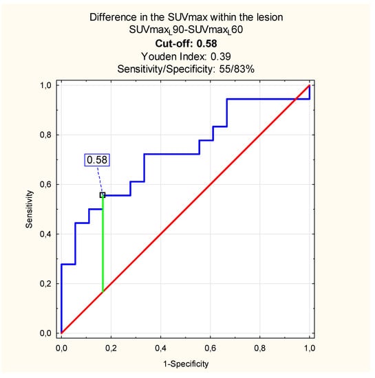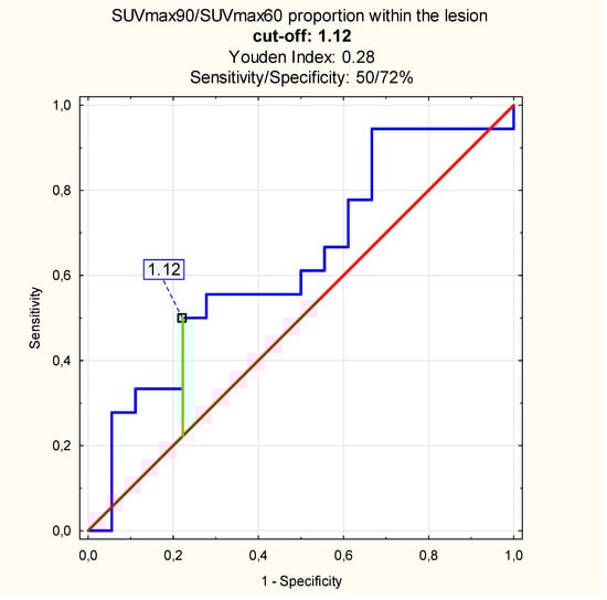 According to the ROC analysis results, the SUVmax proportion cut-off between the lesion and normal PT SUVmax, which differentiates inflammation and malignant PT tumor, was 1.53 at 60 min p.i. (sensitivity/specificity: 72/94%, Youden Index = 0.67) and at 90 min p.i.—1.92 (sensitivity/specificity: 67/100%, Youden Index = 0.67). When comparing the SUVmax proportion of lesions metabolic activity at 90 vs. 60 min p.i., we found the cut-off value of 1.12 (sensitivity/specificity: 50/72%, Youden Index = 0.28, Figure 5).