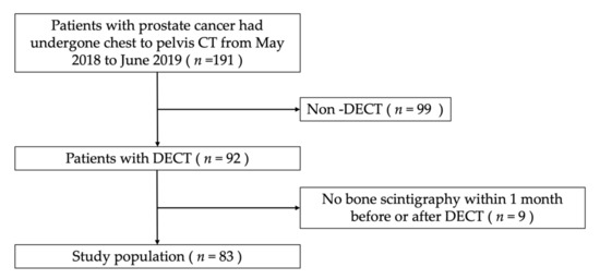 In this study, we reviewed 191 consecutive patients with prostate cancer alone, as they were followed for a long time with a clear clinical course in the hospital, who underwent non-contrast CT from May 2018 to April 2019. All recruited patients had non-contrast CT for cancer staging or restaging. Inclusion criteria were that DECT was performed, bone scintigraphy should be performed within one month before or after DECT, and the progress can be tracked by electronic medical records for at least 1 year. Exclusion criteria were those who have lost raw data of DECT for image reconstruction. Clinical information was obtained from electronic medical records regarding age, gender, pathological findings of primary cancer, clinical diagnosis, and CT and bone scintigraphy date. The final diagnosis of bone metastases was performed by the subsequent clinical course or positive results of radiological studies, i.e., follow-bone scintigraphy.