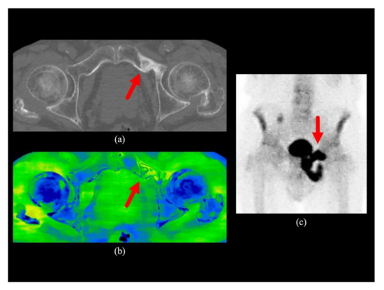 Clinical case 2. A man in his 70s with prostate cancer. (a) The transaxial image of the conventional CT of the pelvis does not indicate abnormal concentrations in the iliac bone; (b) There is an increase in water density compared to the contralateral side in the transaxial water-HAP image of the pelvis (red arrow); (c) The anterior view of the bone scintigraphy shows the right iliac bone metastases (red arrow). HAP; Hydroxyapatite.