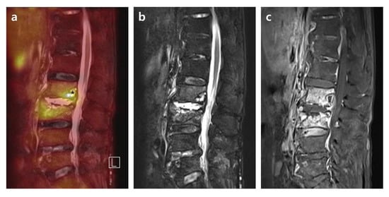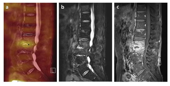 - Fahnert, J.; Purz, S.; Jarvers, J.S.; Heyde, C.E.; Barthel, H.; Stumpp, P.; Kahn, T.; Sabri, O.; Friedrich, B. Use of Simultaneous 18F-FDG PET/MRI for the Detection of Spondylodiskitis. J. Nucl. Med. 2016, 57, 1396–1401. [Google Scholar] [CrossRef] [PubMed]