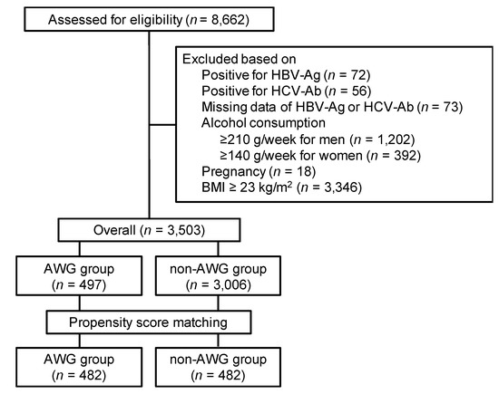 Figure 1 shows a summary of the participant selection procedure. A total of 8662 participants underwent abdominal ultrasonography during the study period. We excluded 5159 participants based on the exclusion criteria; thus, 3503 participants were eligible for this study. The background characteristics of the participants are listed in Table 1. Of the 3503 eligible participants, 497 had experienced adult weight gain and were categorized into the AWG group; 3006 had not experienced and were categorized into the non-AWG group. Finally, according to the propensity score, we matched 482 (97.0%) participants in the AWG group with 482 participants in the non-AWG group.