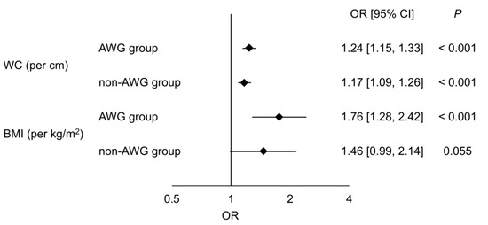 Figure 2 shows the associations between anthropometric parameters and NAFLD evaluated by univariate logistic regression analysis in the matched AWG and non-AWG groups. WC (per cm) was significantly associated with NAFLD in both the matched AWG (OR, 1.24; 95% CI, [1.15, 1.33]; p < 0.001) and non-AWG groups (OR, 1.17; 95% CI, [1.09, 1.26]; p < 0.001). We also confirmed a significant association between BMI (per kg/m2) and NAFLD in matched participants with AWG ≥ 10 kg (OR, 1.76; 95% CI, [1.28, 2.42]; p < 0.001), but the association was not significant in those without AWG ≥ 10 kg (OR, 1.46; 95% CI, [0.99, 2.14]; p = 0.055).